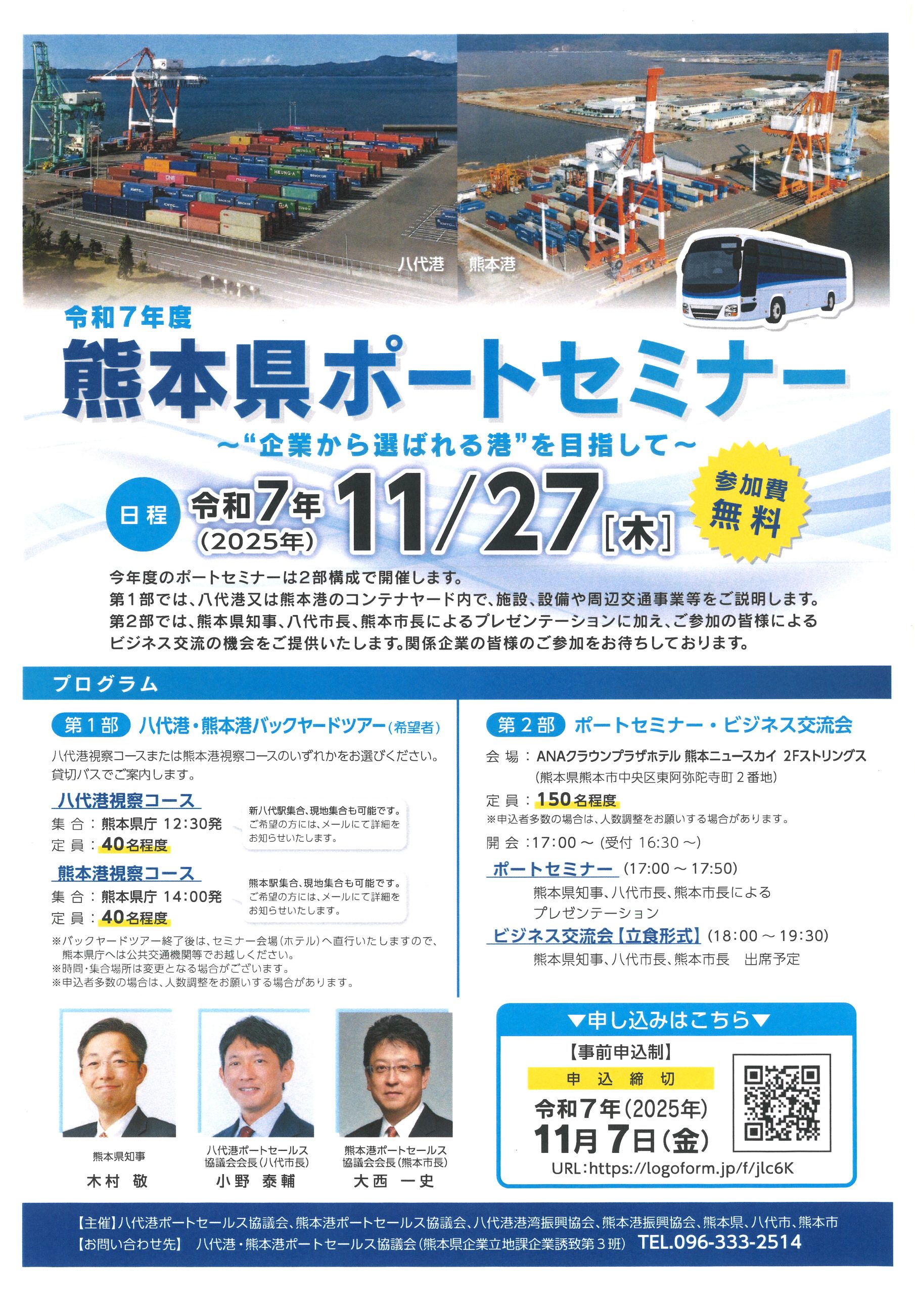 2025.10.29 2025年11月27日 「熊本県ポートセミナー」の開催について(ご案内) お知らせ 熊本県の熊本港と八代港は、近年、輸出入の利用が堅調に推移し、その重要さが増してきています。そこで、「選ばれる熊本を目指し 続きを読む »